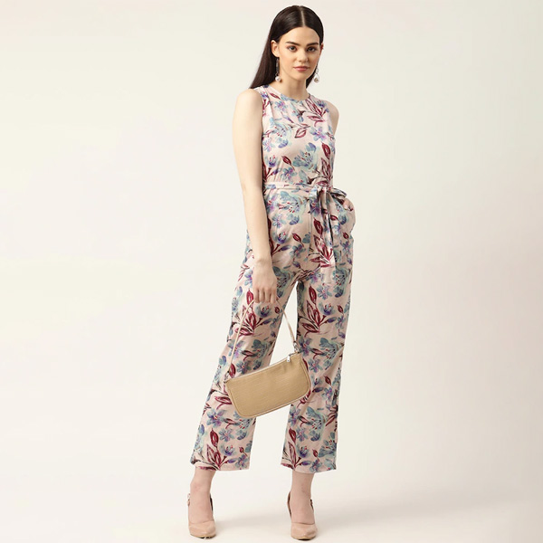 Beige and maroon printed culotte jumpsuit with waist tie-ups ,has a round neck, sleeveless, 2 pockets