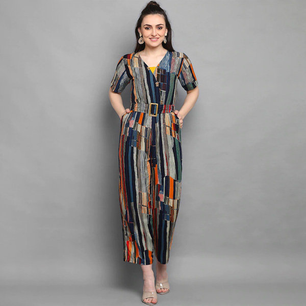 Blue and orange printed basic jumpsuit ,has a v-neck, short sleeves, 2 pockets