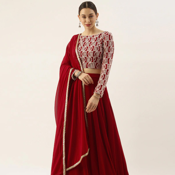 Maroon embroidered lehenga choli with dupatta, thread work. Maroon embroidered ready to wear blouse, has a round neck, long sleeves, button closure. Maroon solid ready to wear lehenga, has zip closure, flared hem. Maroon solid dupatta, taping border.