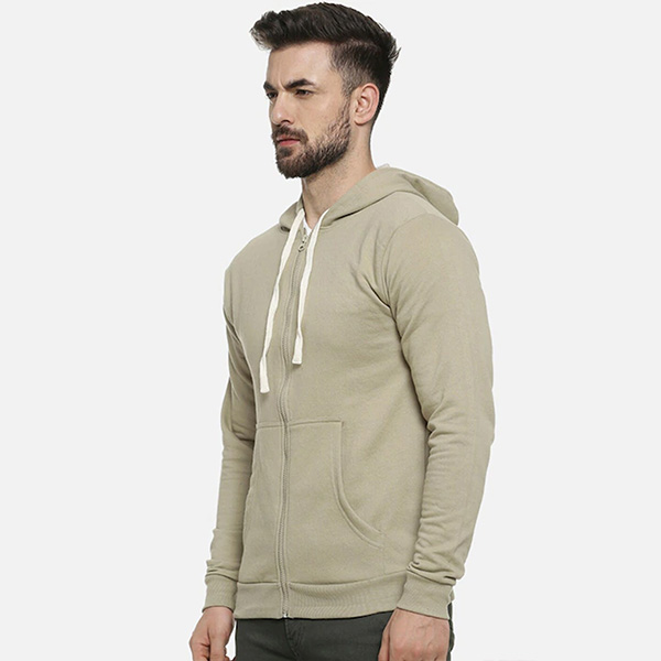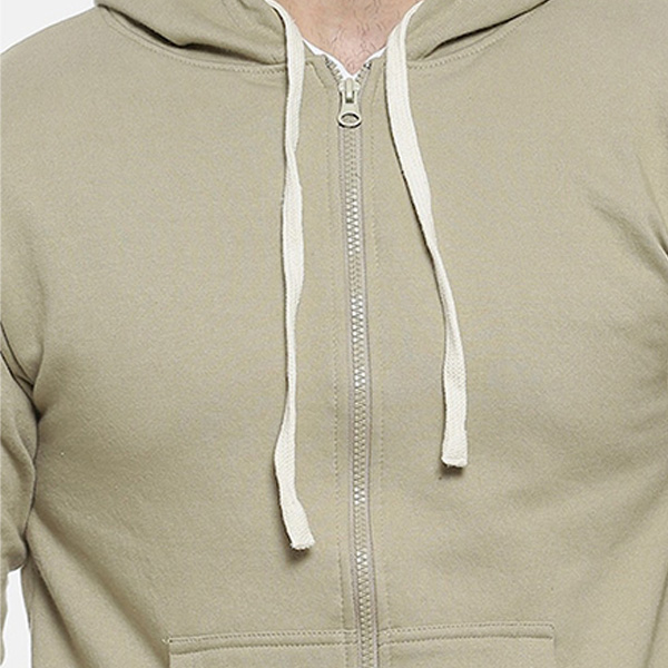 Olive Green solid sweatshirt, has a hood, two pockets, long sleeves, zip closure, straight hem
