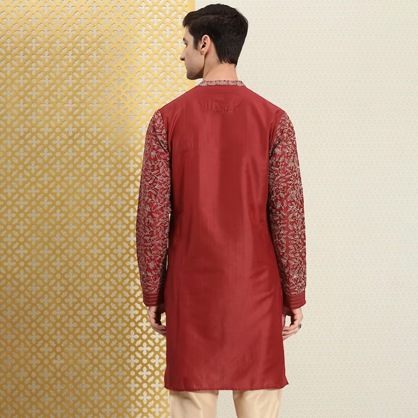 Men Red & Gold-Toned Ethnic Motifs Printed Thread Work Kurta