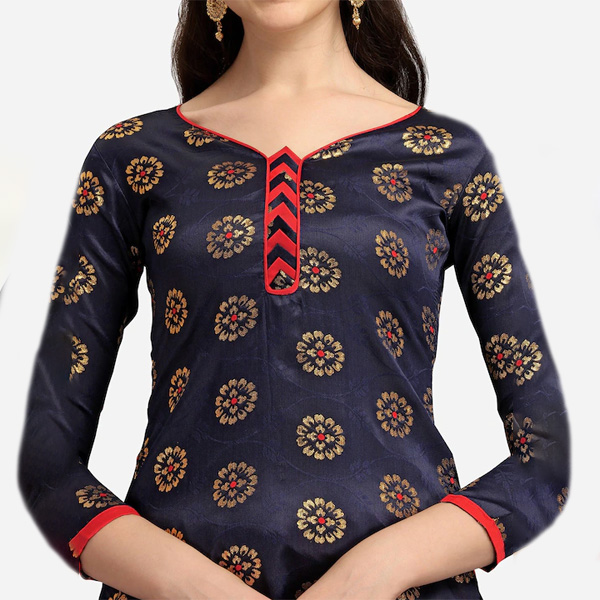 Navy blue and red woven design banarasi unstitched dress material