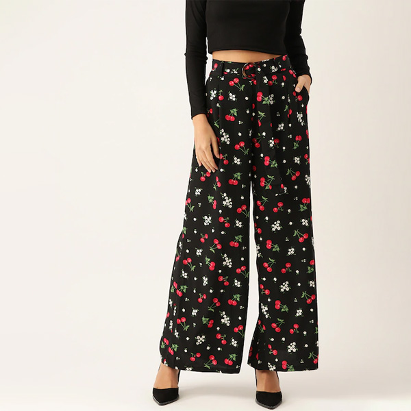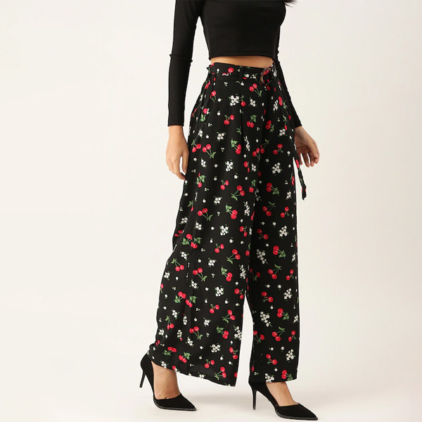 Women Black & Red Cherry Print Wide Leg Palazzos