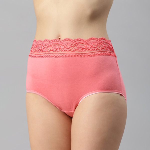 Pack of five hipster briefs, Three solid hipster brief with lace detail in grey melange, red and pink, has an outer elasticated waistband, and a double layered gusset, Two polka dot printed hipster briefs in red and cream, has an outer elasticated waistband, and a double layered gusset.