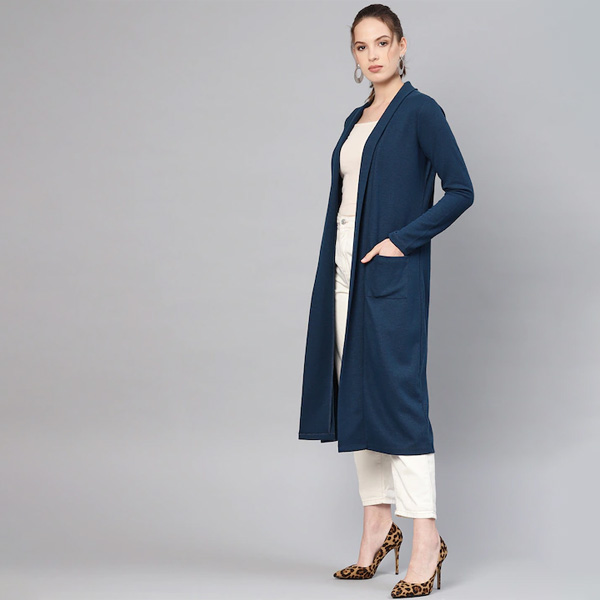 Teal blue solid open front longline winter shrug, has long sleeves, straight hem, two pockets